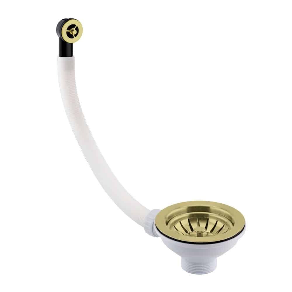 One of our latest range of high quality Kitchen Sink Mixers in a on trend Brushed Gold Finish. Includes a Kitchen Basket Strainer Waste with Round Overflow Port. The Tap has a modern design, dual lever handles and swivel spout, its sure to enhance any modern kitchen style